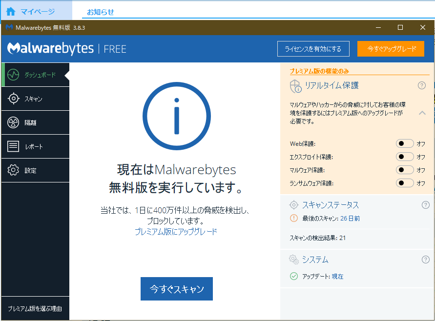 Malwarebytesはマルウェアやスパイウェアに特化したウイルス対策ソフトです。