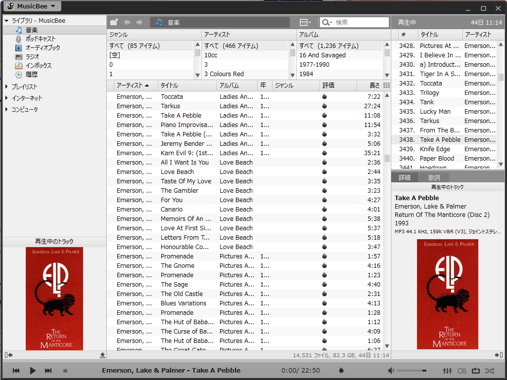 音楽ファイルの数が少ない時軽いソフトでも、1万曲とか登録すると一気に重くなるケースが多いんですが、Music Beeでは、あまり重くなりません。