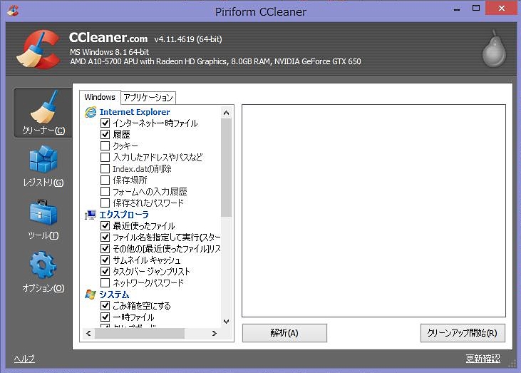 クリーナーの所でインターネット関係とエクスプローラー、システムを解析した後クリーンアップ。
