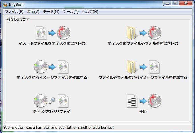 ImgBurnを立ち上げた時、エラーメッセージが出ますが、問題なく日本語表示になっているので、無視しましょう。