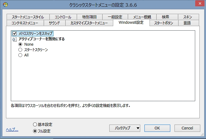 このソフトをインストールした後、Classic Shell の「クラシックスタートメニュー」で、「Windows8設定」を選び、メトロスクリーンをスキップの所にチェックを入れれば、これ以降Windows8を起動した時、自動でスキップしてくれるようになります。