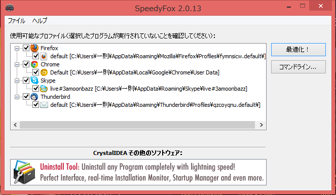 解凍して出来たSpeedyFox.exeをダブルクリックして、最適化(optimize)を実行すれば、チェックの入っているもの全てを最適化してくれます。